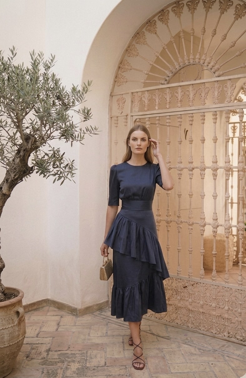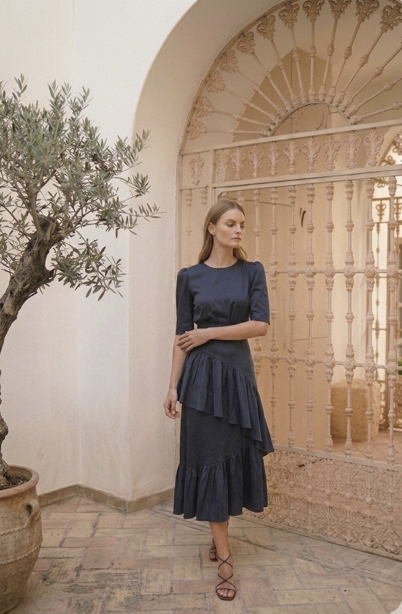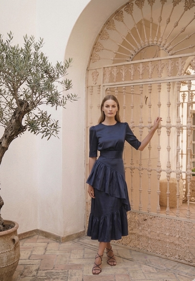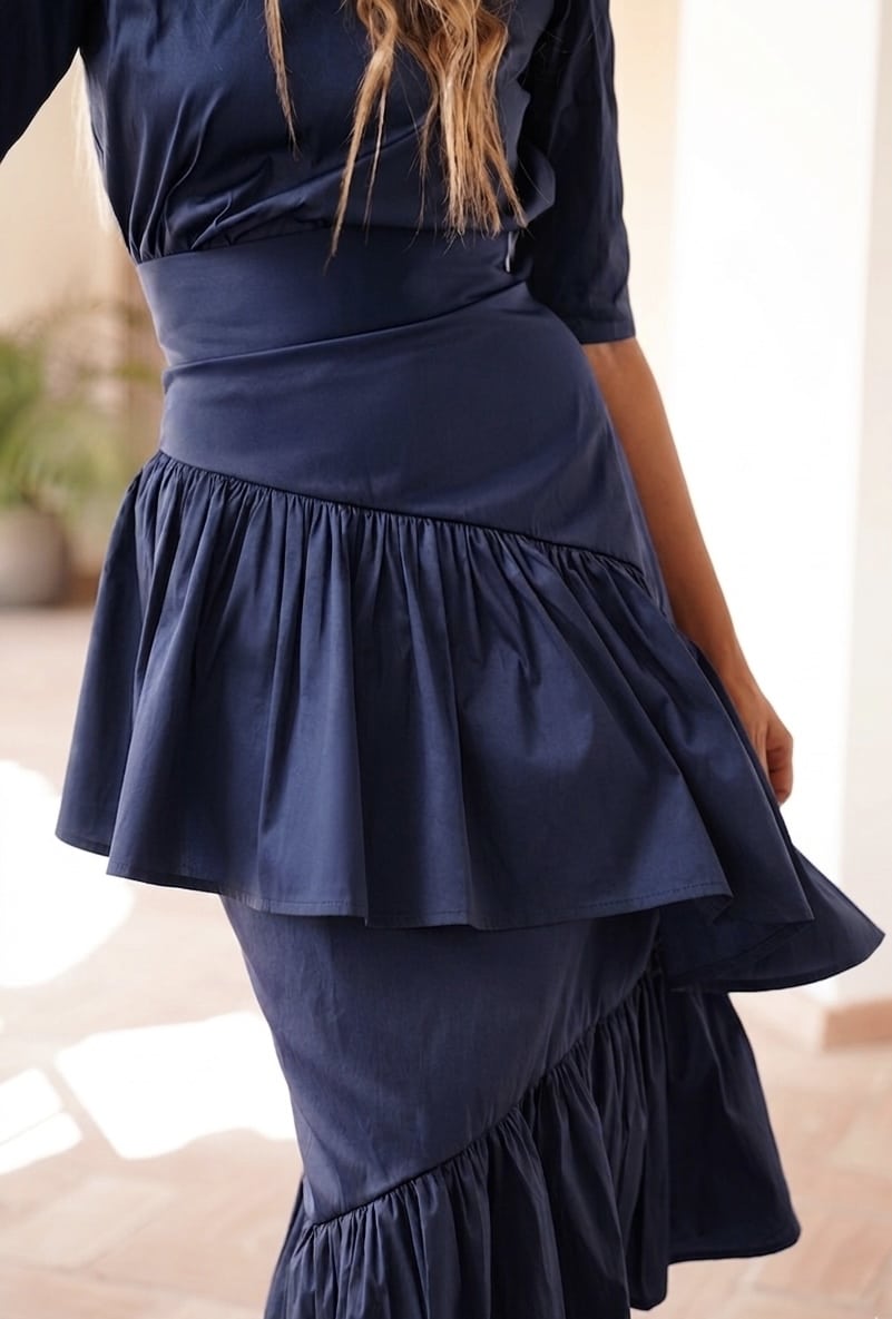 Falda midi de tafetán azul marino con volantes y bajo asimétrico. Una falda ideal para ser la más estilosa. Cierre posterior con cremallera invisible.