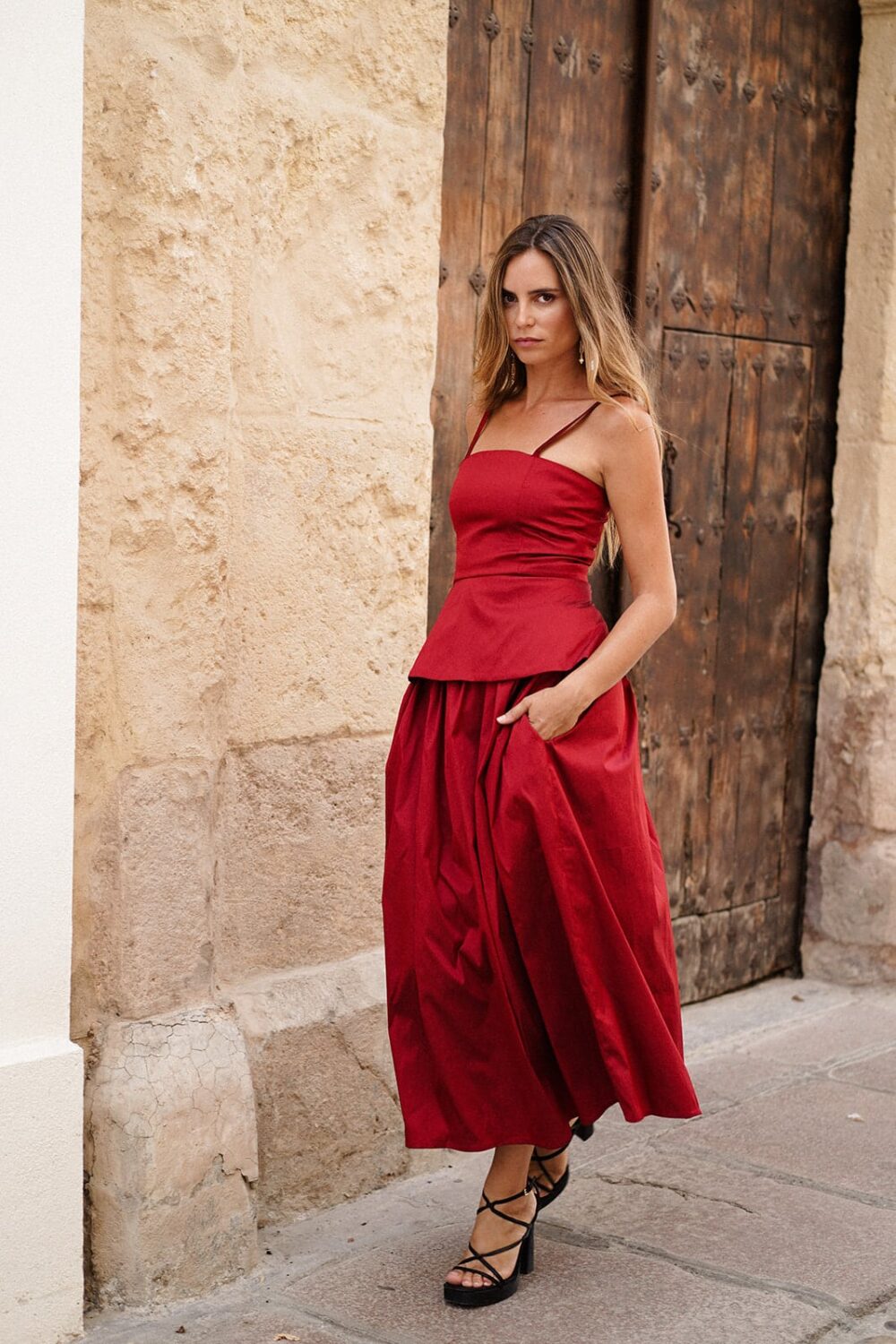 Falda midi con vuelo en tafeta color rojo oscuro. Cierre trasero con cremallera invisible y bolsillos laterales.