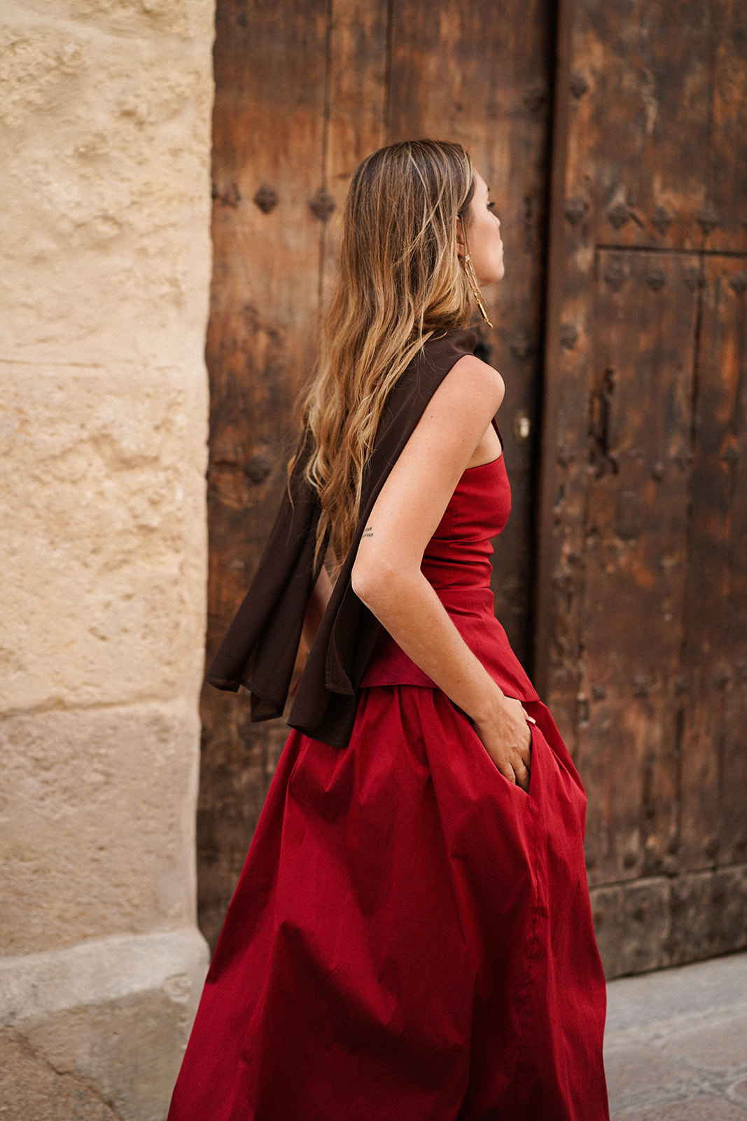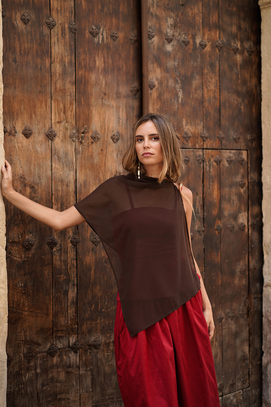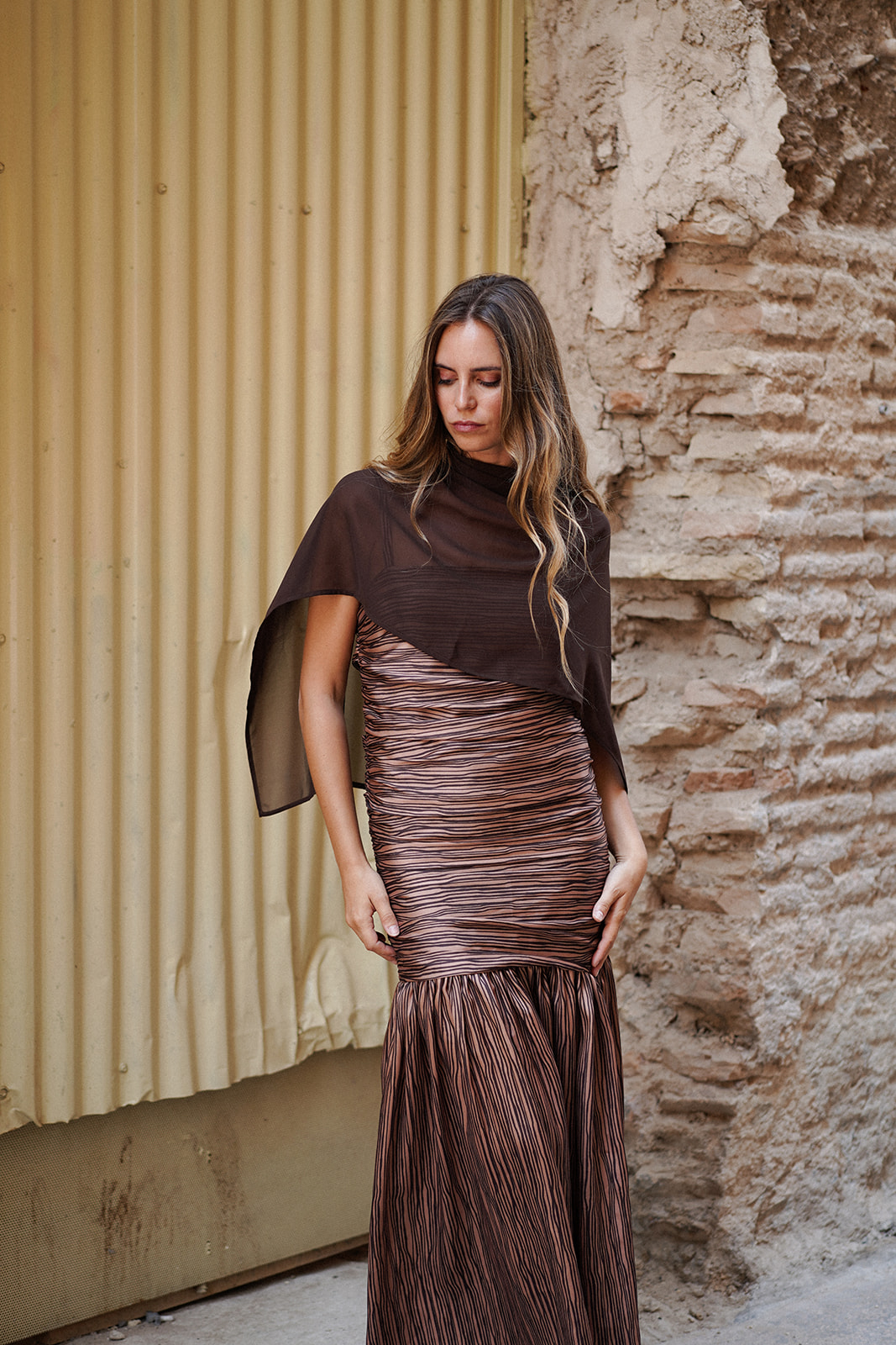Gasa marrón. Una prenda versátil, sofisticada y ligera. Su diseño fluido con caída aporta movimiento y elegancia, convirtiéndola en el complemento perfecto para vestidos de fiesta o conjuntos formales. Lo puedes combinar con el vestido Eugenia, Zoe…