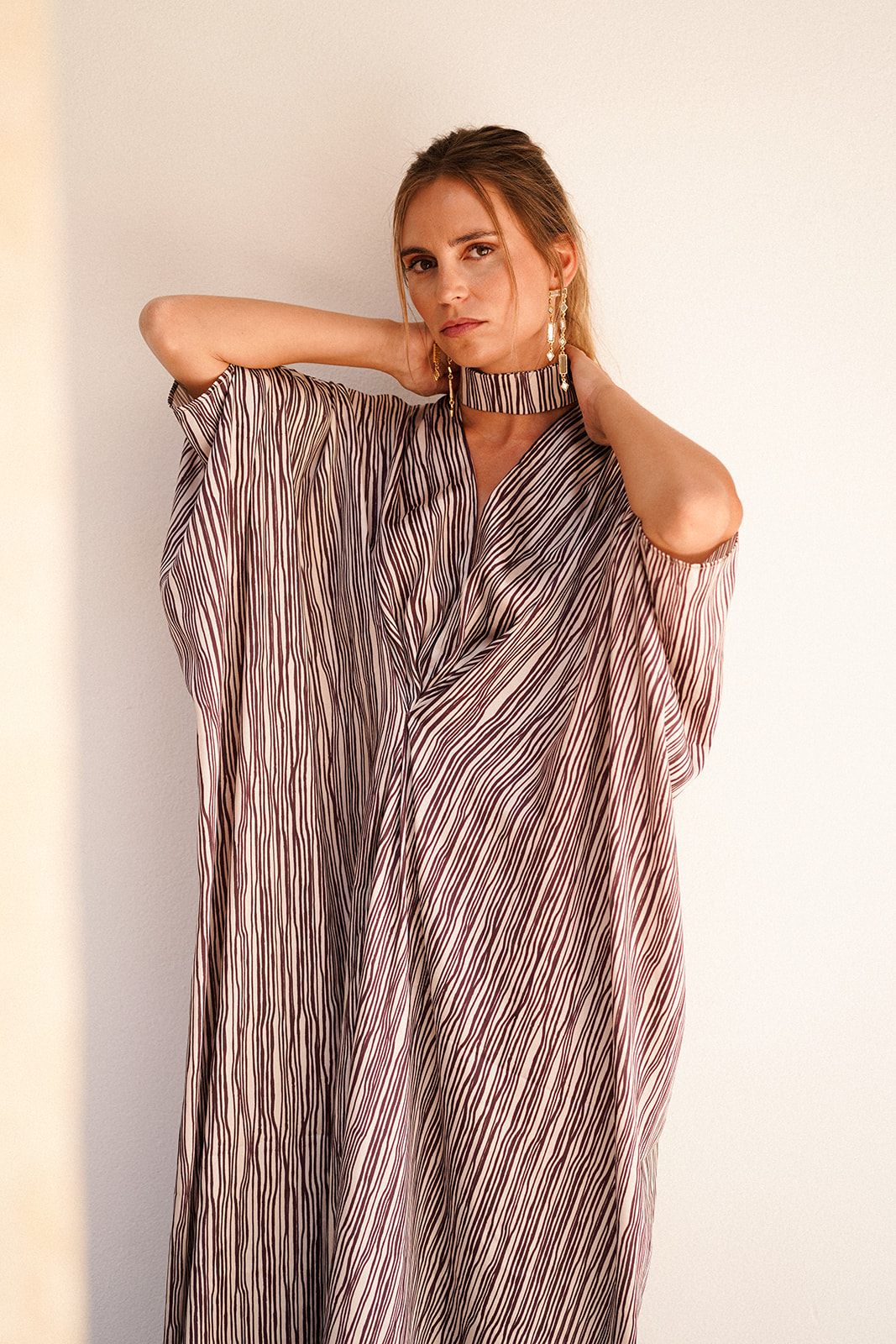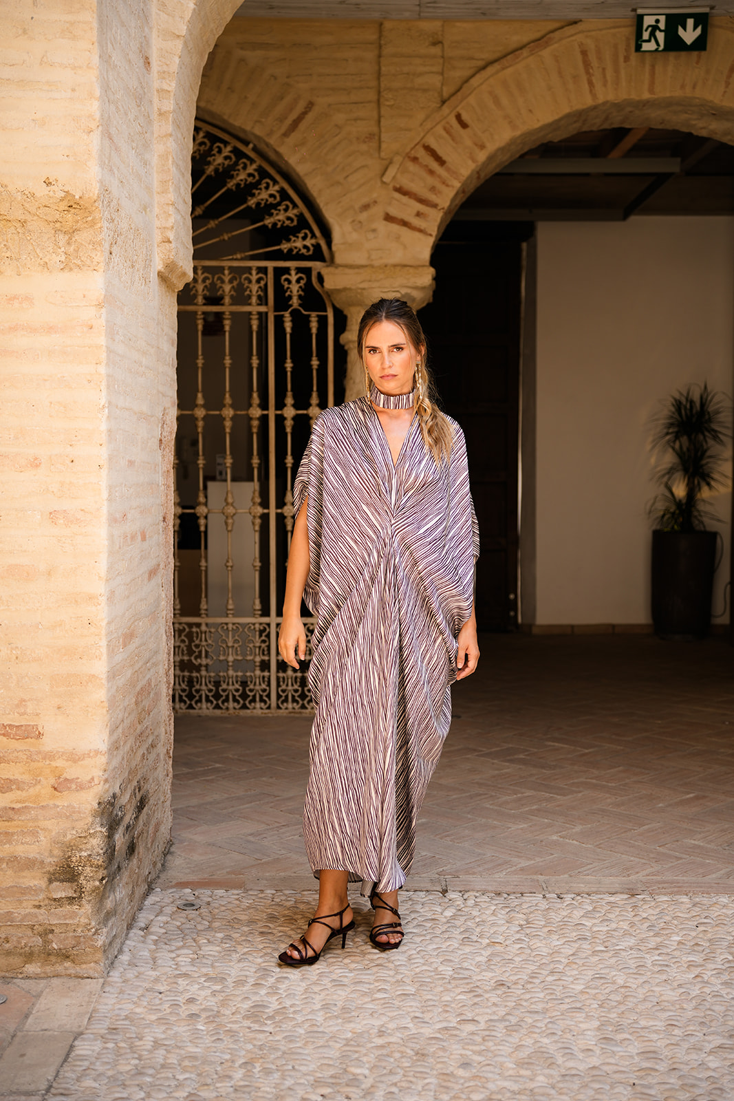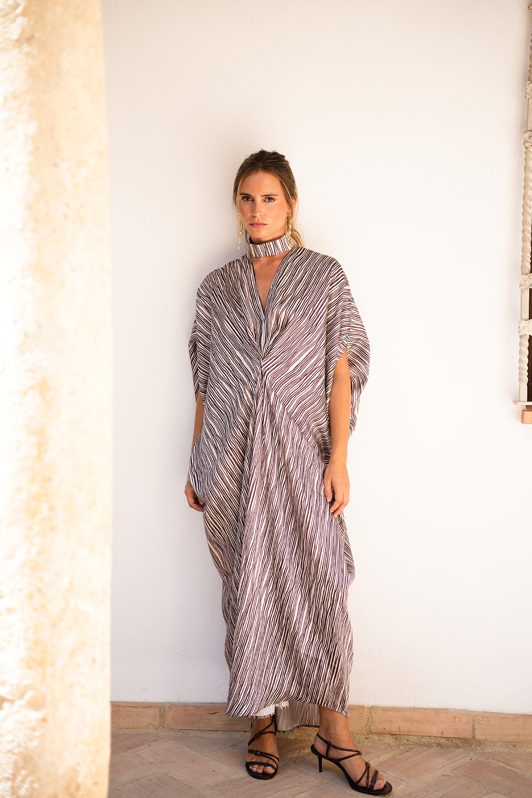 Kaftán con manga y escote en pico. Una prenda ligera que sienta bien a todo el mundo. Su diseño fluido con caída aporta movimiento y elegancia, convirtiéndola en un vestido super estiloso. Incluye choker del mismo tejido.