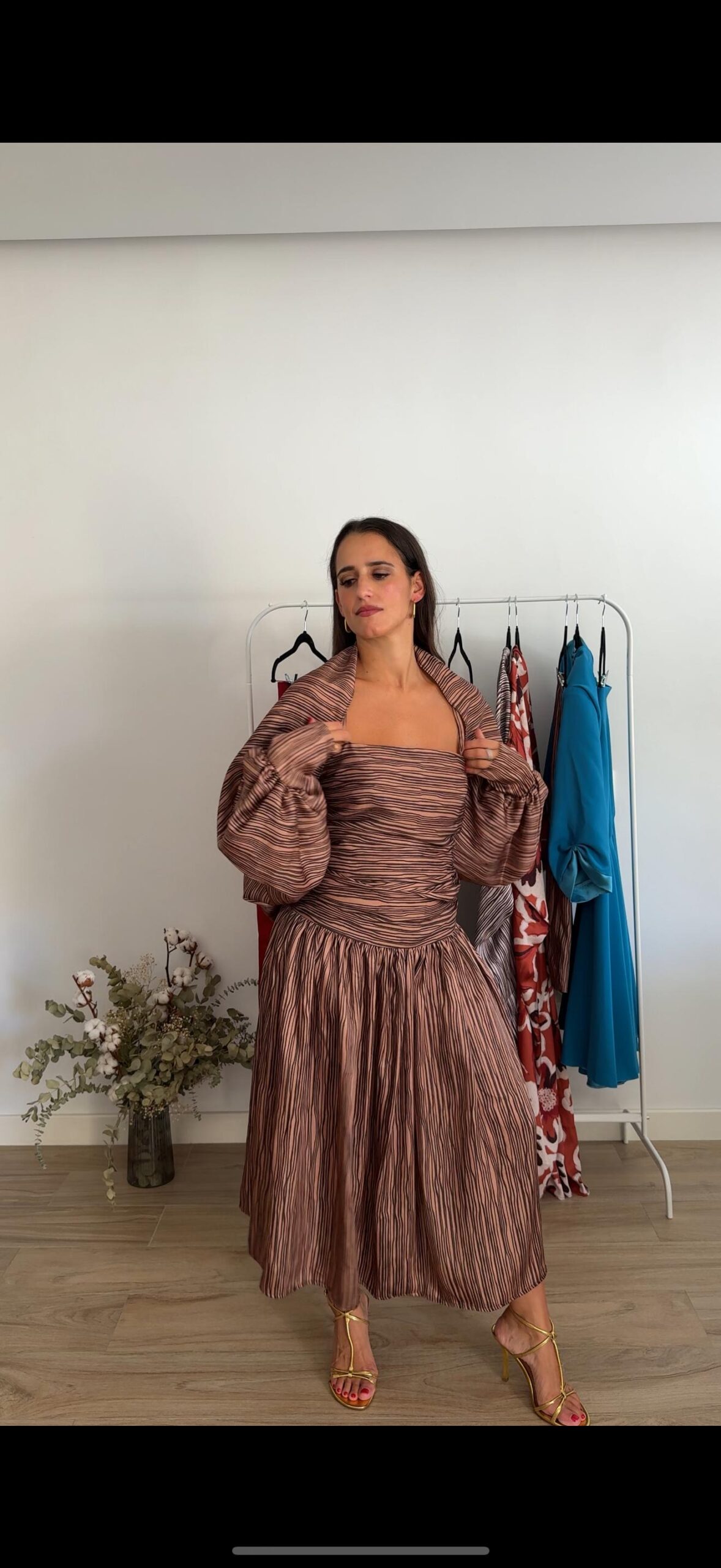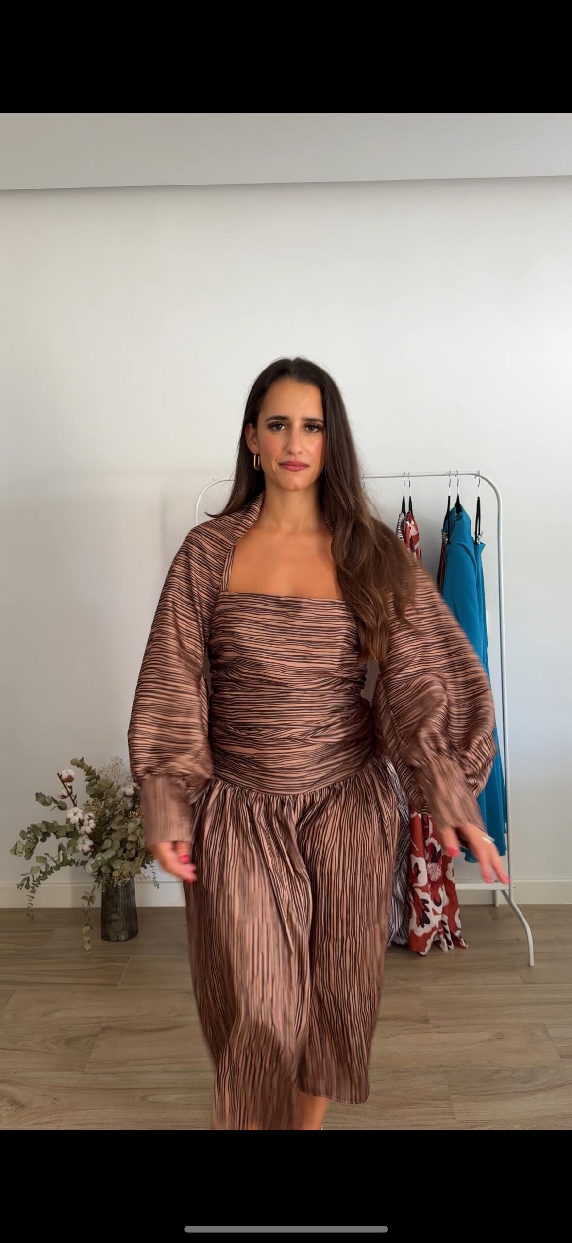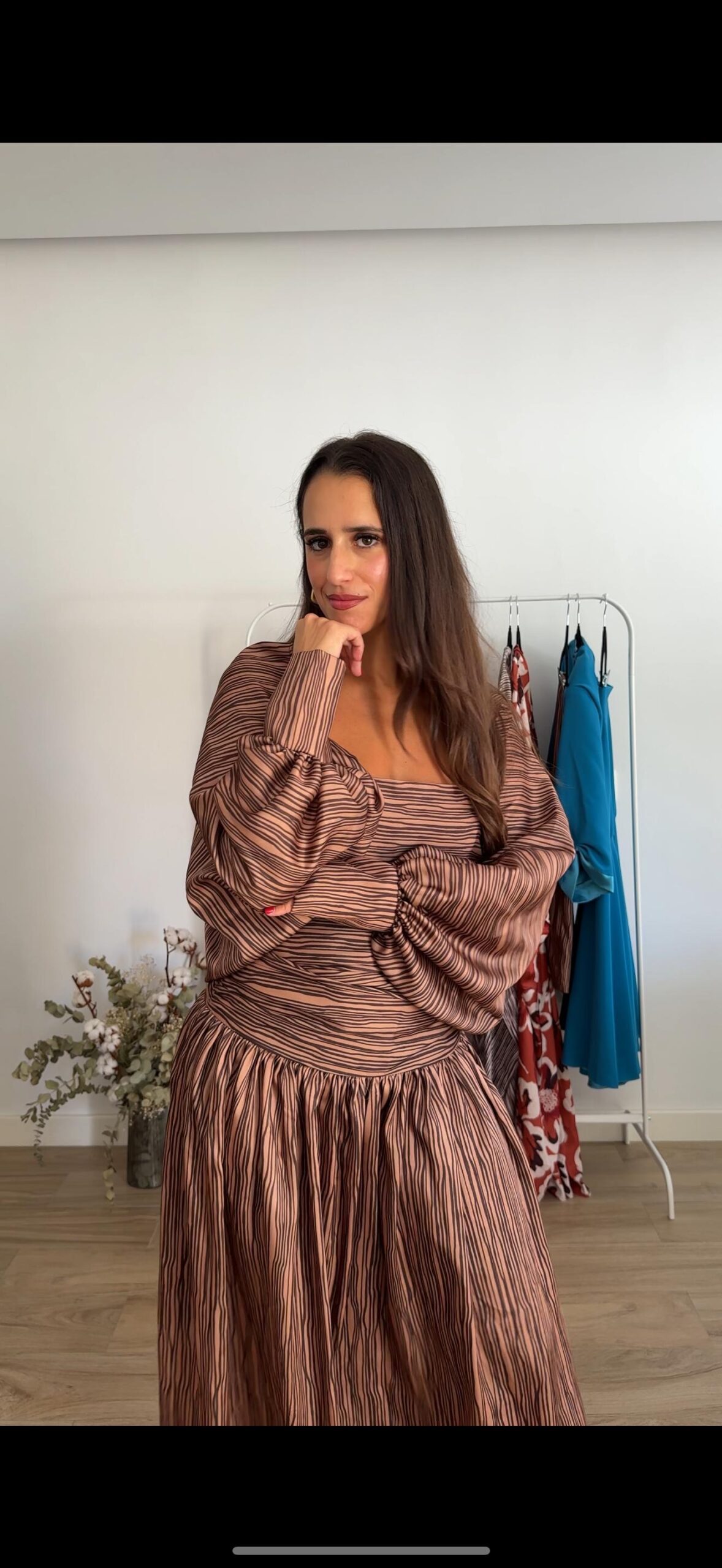 Mangas con puño en diferentes tonos de marrón de rayas uniformes. Una prenda versátil, sofisticada y ligera. Su diseño fluido con caída aporta movimiento y elegancia, convirtiéndola en el complemento perfecto.. Lo puedes combinar con el vestido Luisa, Eugenia…