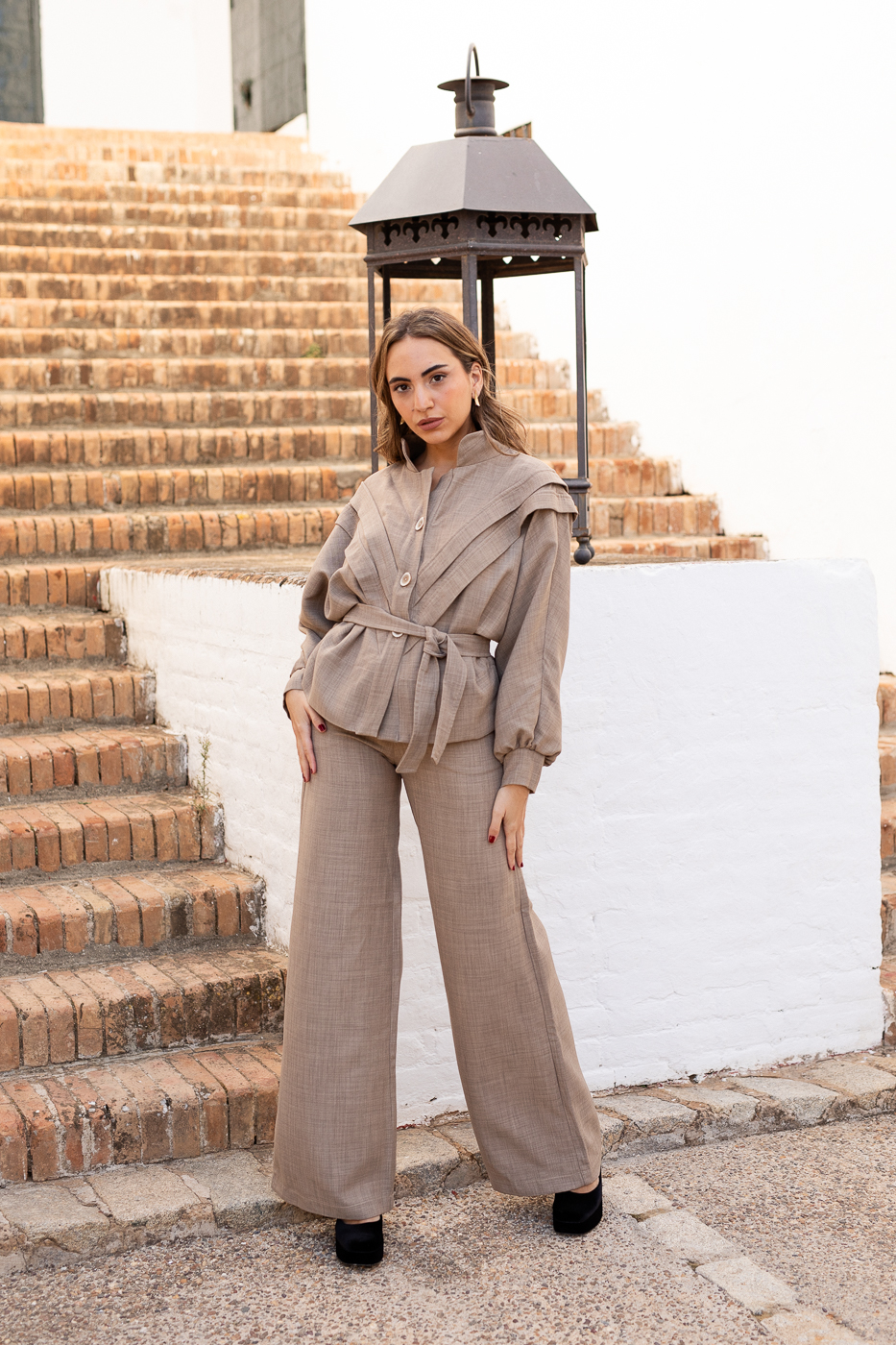 Pantalón con diseño acampanado, en tejido color beige. Combínalo con la chaqueta o top Filipa. Es el conjunto ideal para aquellas que apuestan por set de dos piezas elegantes y cómodos.