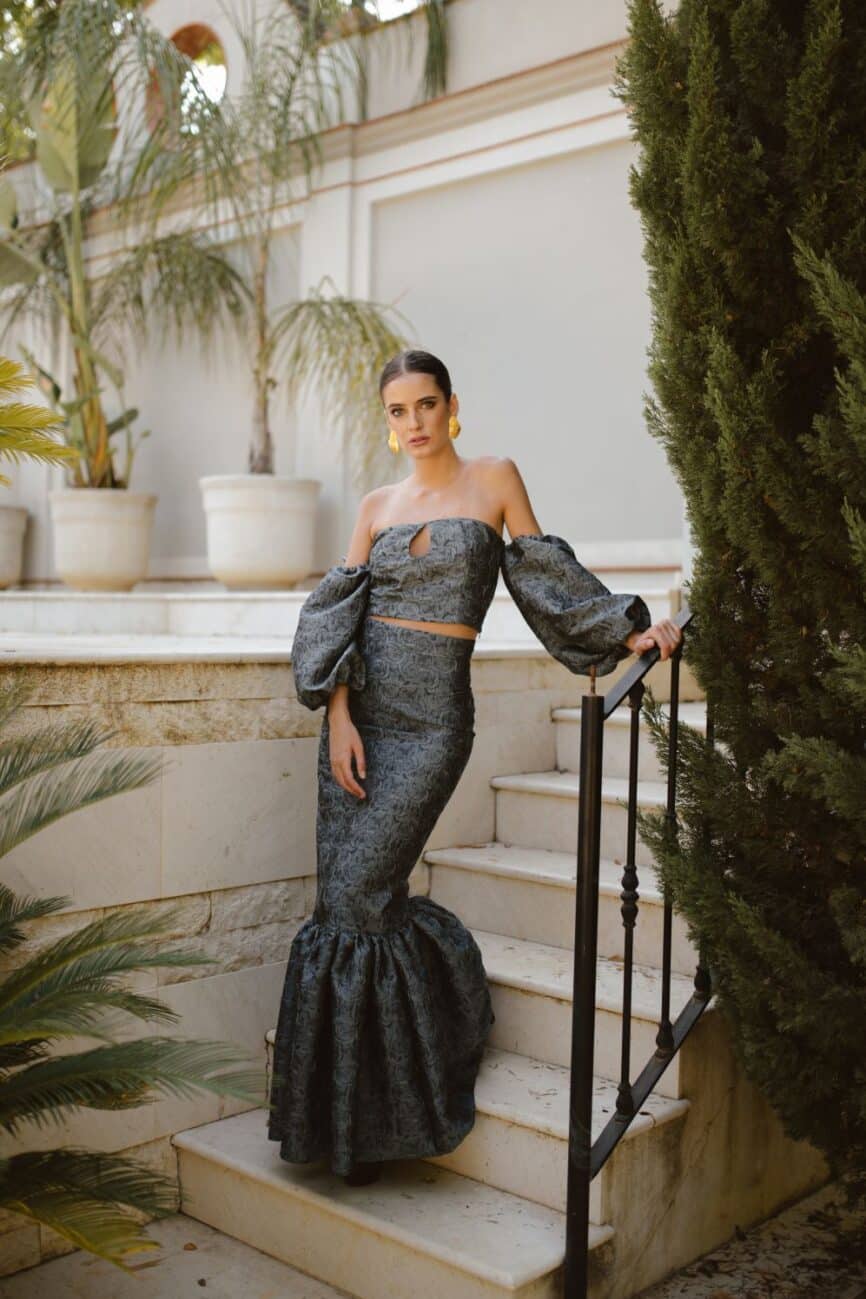 Top brocado en gris y negro haciendo rosas con mangas en globo. Una auténtica joya de top