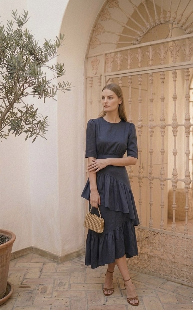 Top azul marino de tafetán con manga al codo. Ideal para combinar con la falda de volantes a juego y para tú día día.