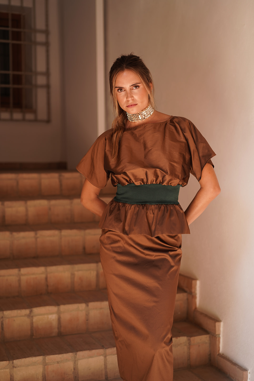 Top de tafetán marrón con cintura de punto en verde botella y volante peplum. Un conjunto sofisticado y estiloso.