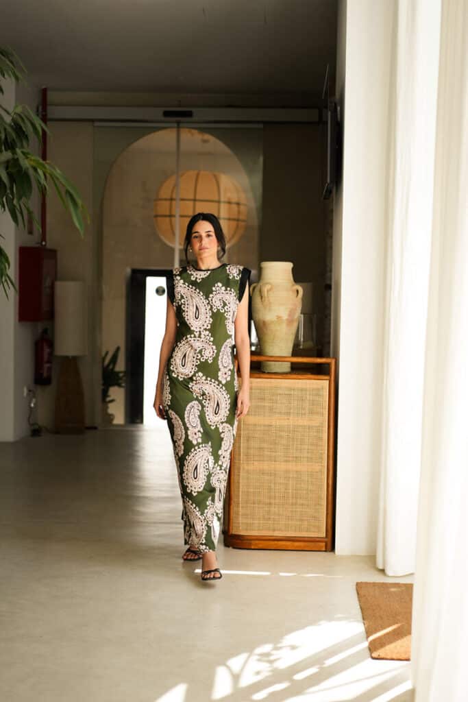 Top manga corta con hombreras y cierre posterior con botón forrado. Estampado verde en cachemir